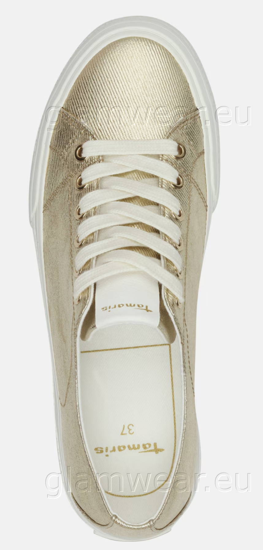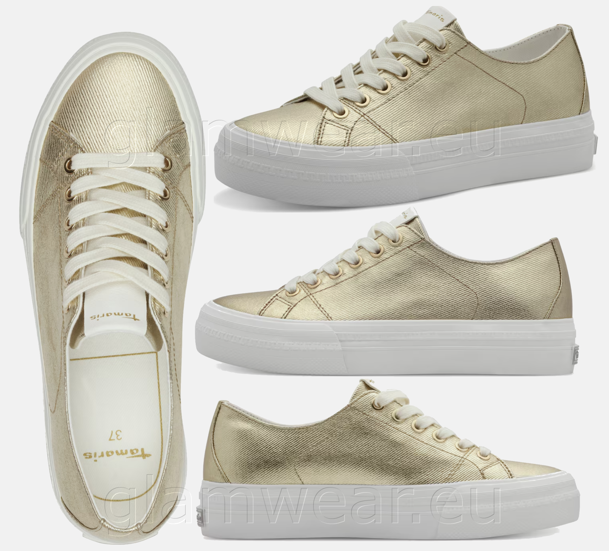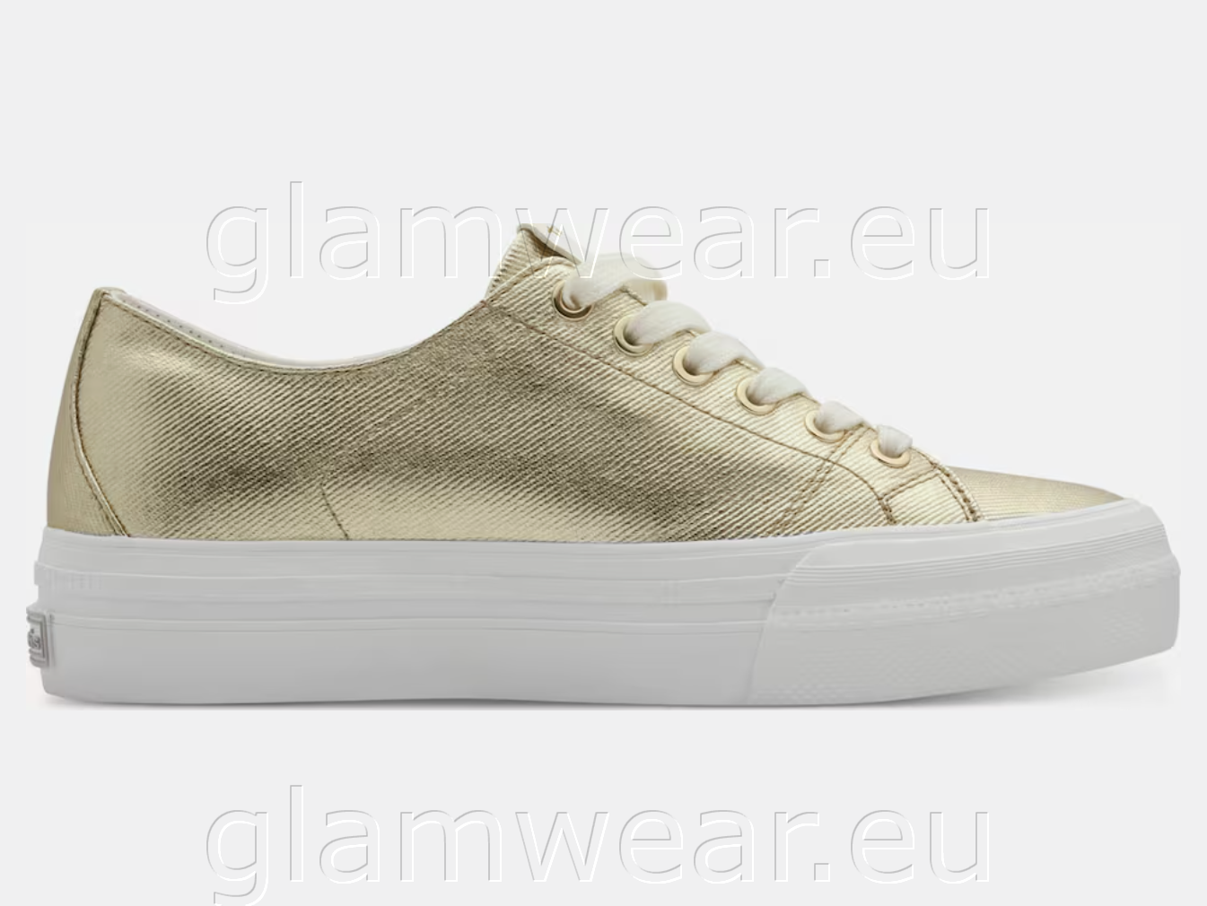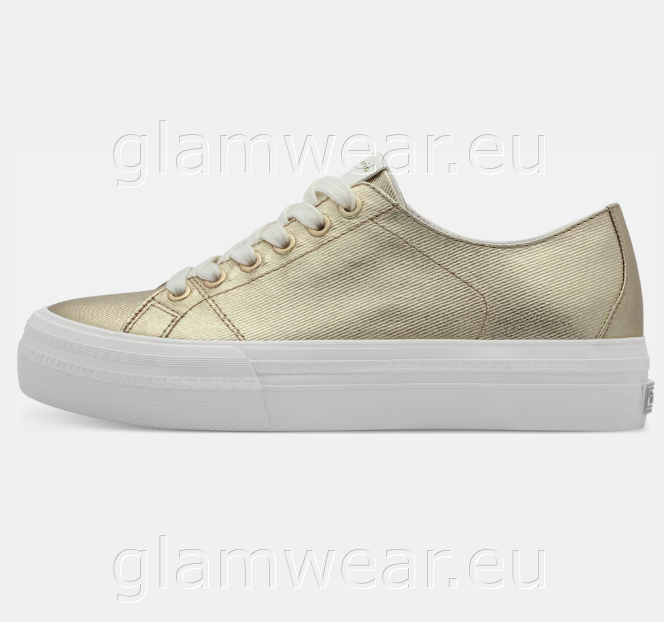 Tamaris trendikad kuldsed platvormtallaga jalanõud naistele. Stiilsed ja mugavad Tamarise vegan tossud sobivad ideaalselt igapäevaseks kandmiseks. Trendika disainiga jalanõud on valmistatud hingavast tekstiilist pealispinnaga, mis tagab jalale mugavuse kogu päeva vältel. Pehme tekstiilvooder ja pehmendusega sisetald pakuvad lisamugavust ning hea toestuse. Jalanõudel on vastupidav profileeritud sünteetiline välistald koos 3,5 cm platvormtallaga, mis lisab pikkust ja modernset välimust.
