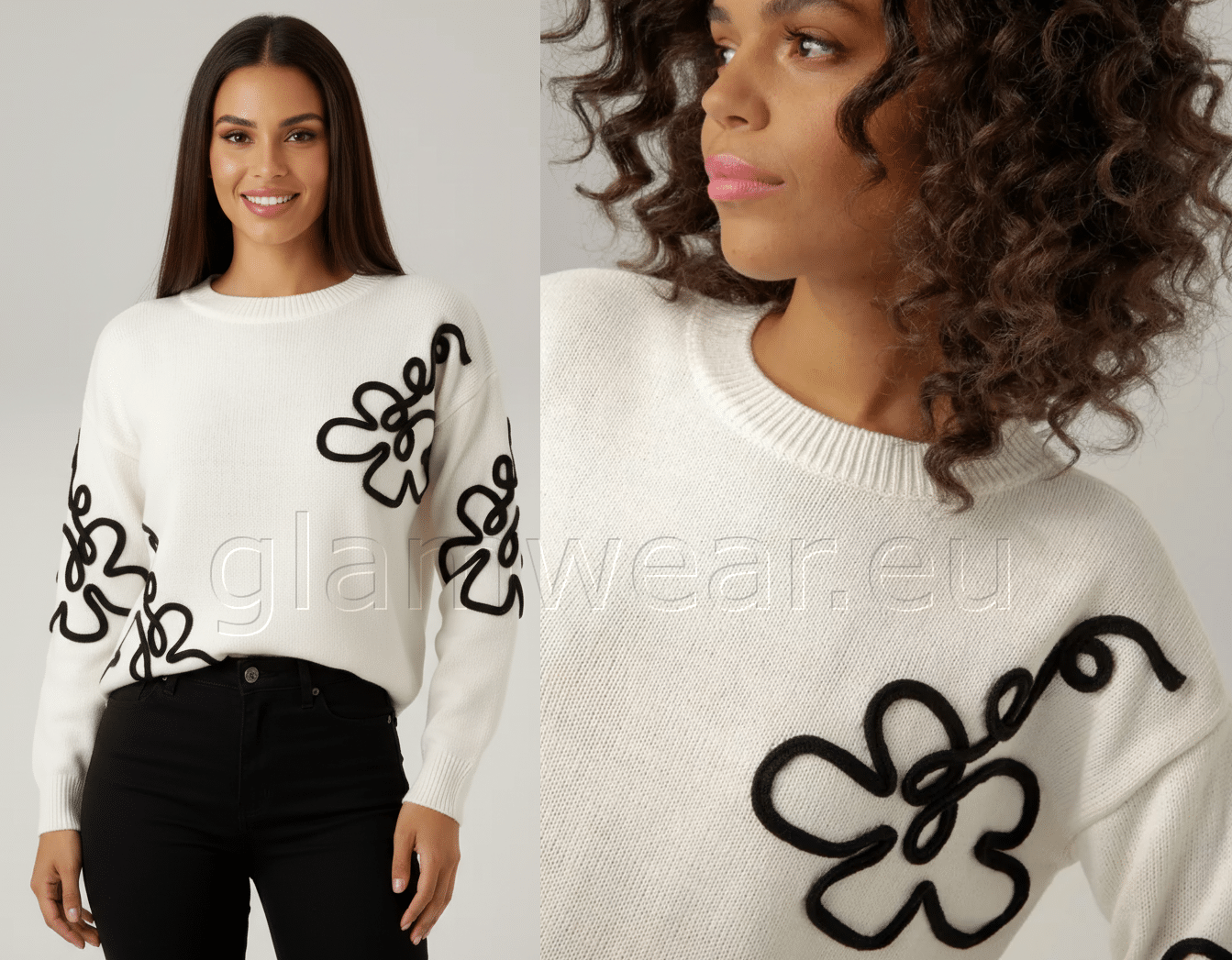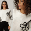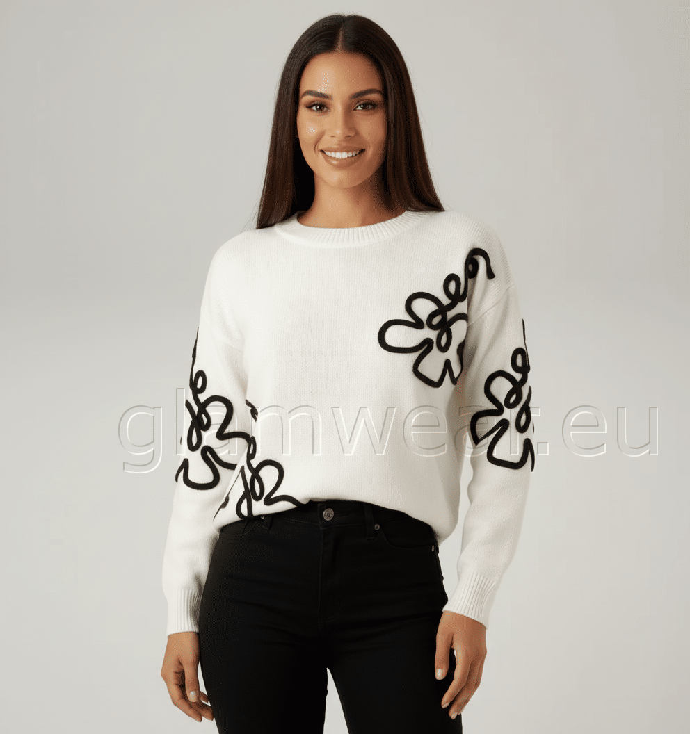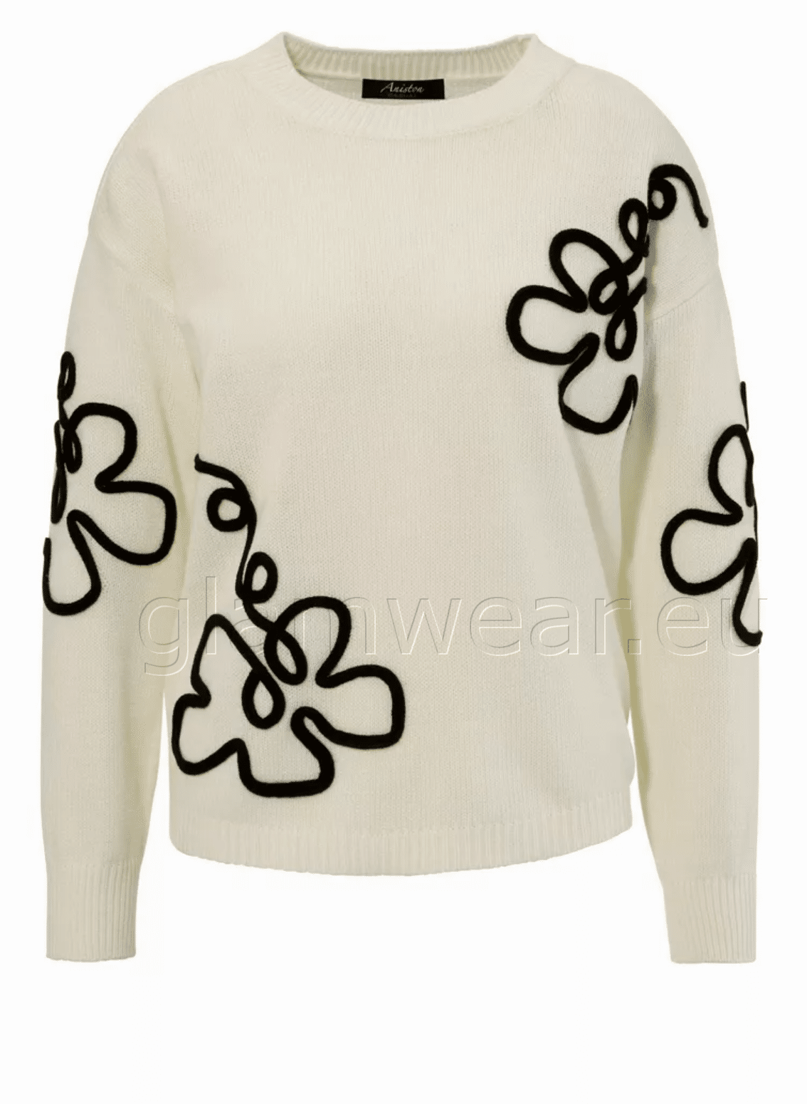 Aniston kena kampsun. Ümara kaelusega kampsun, langetatud õlad, ekstravagantsed lilleaplikatsioonid, pikad varrukad, avar lõige, materjal: 100% polüakrüül.