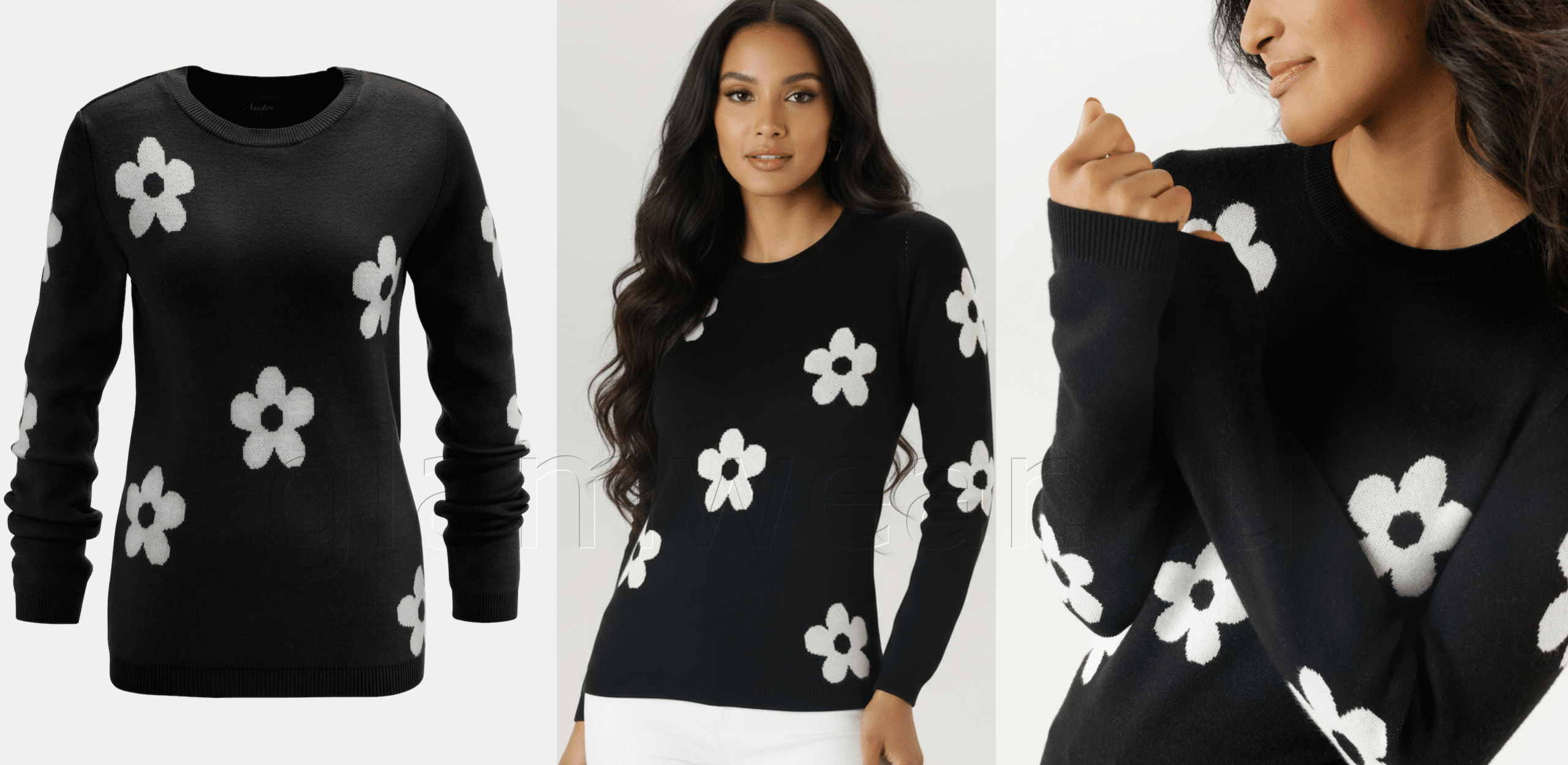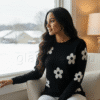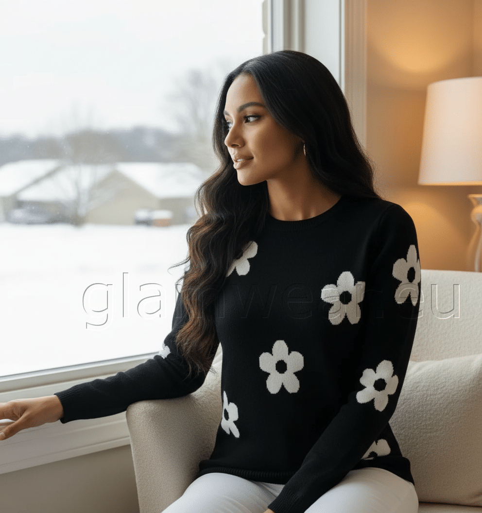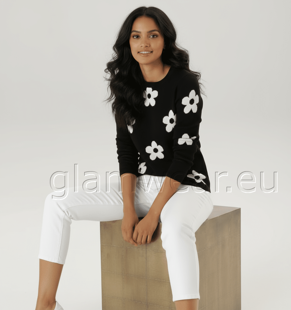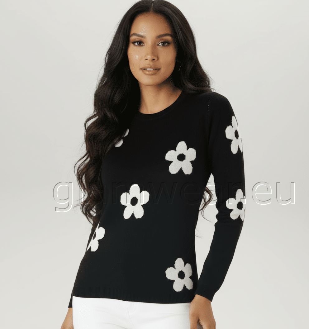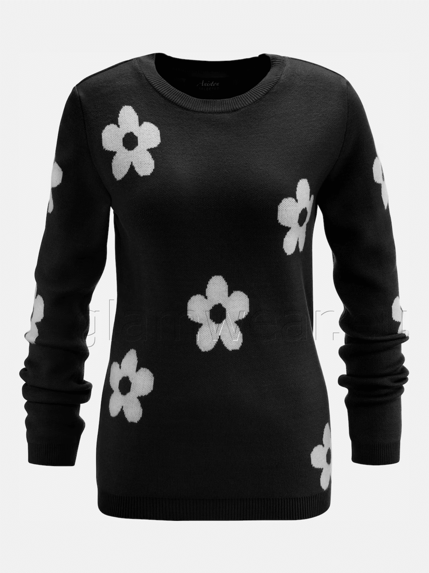 Aniston pehme kampsun. Kootud lillemustriga kampsun, ümara kaeluse ja pikkade varrukatega, valmistatud pehmest viskoosisegust, soonikkoes kätistega alläärel ja varrukatel, figuuri järgiva lõikega, materjal: 50% viskoos, 26% polüamiid, 24% polüester.