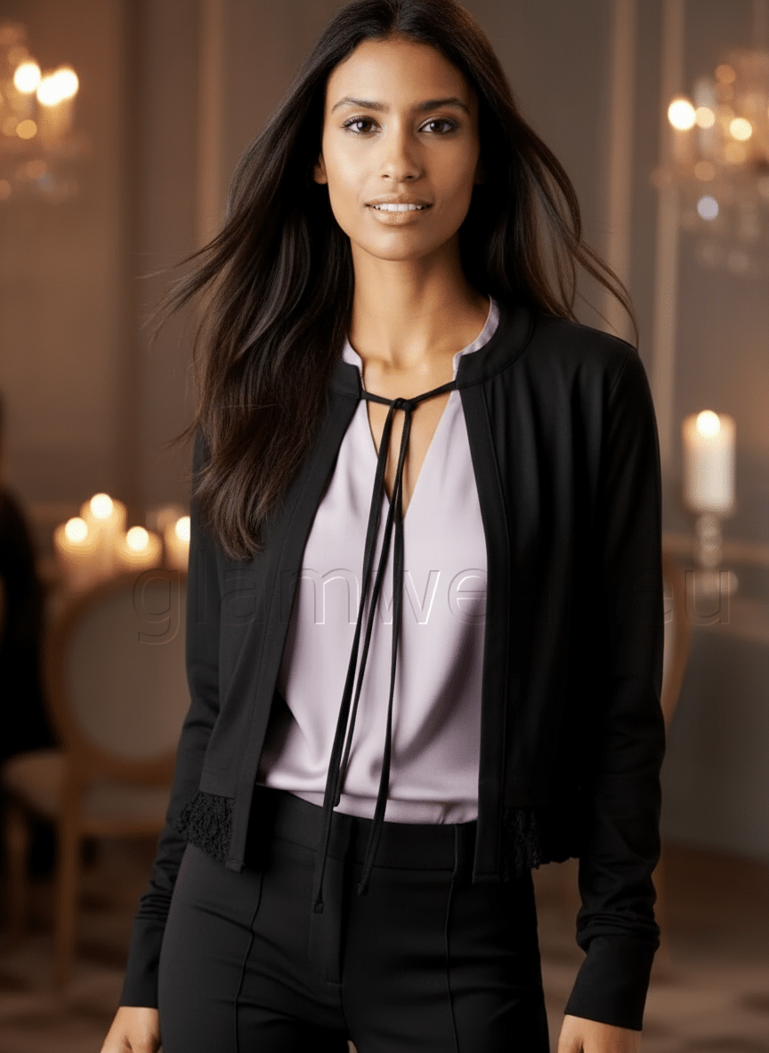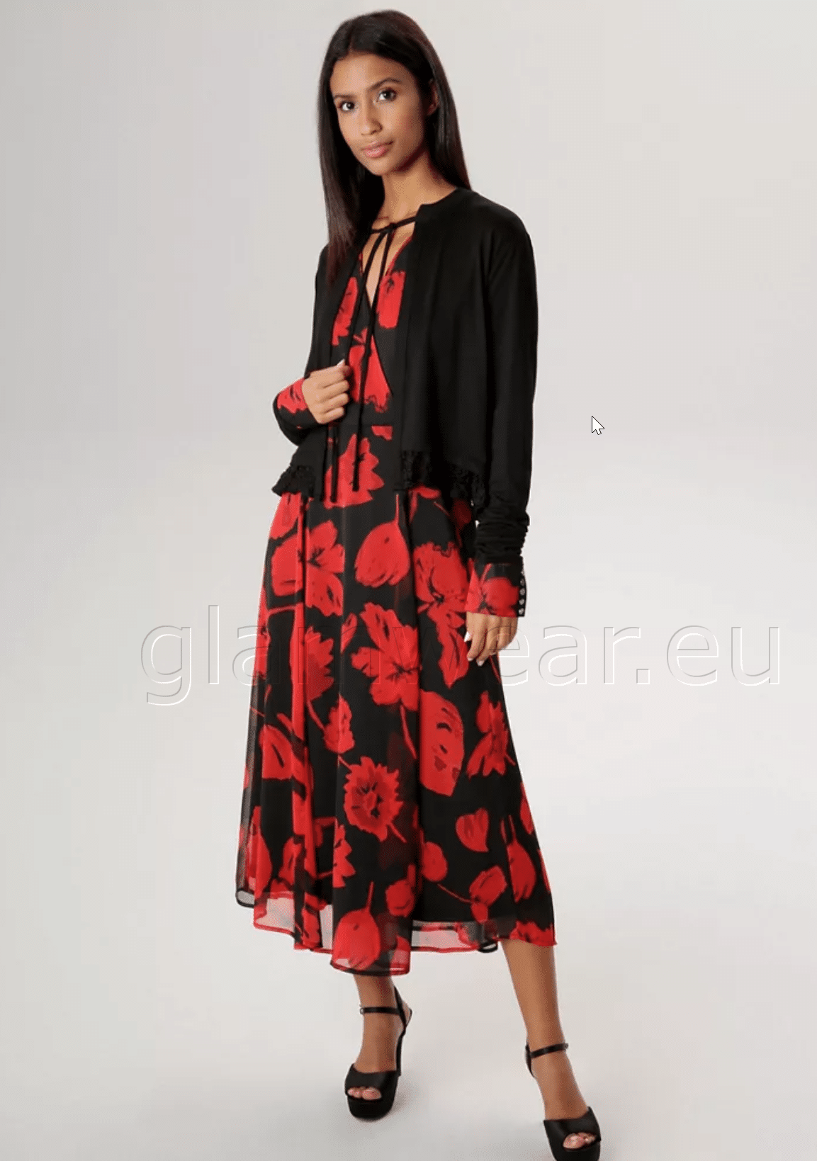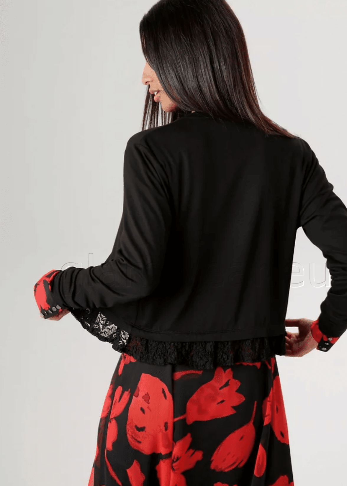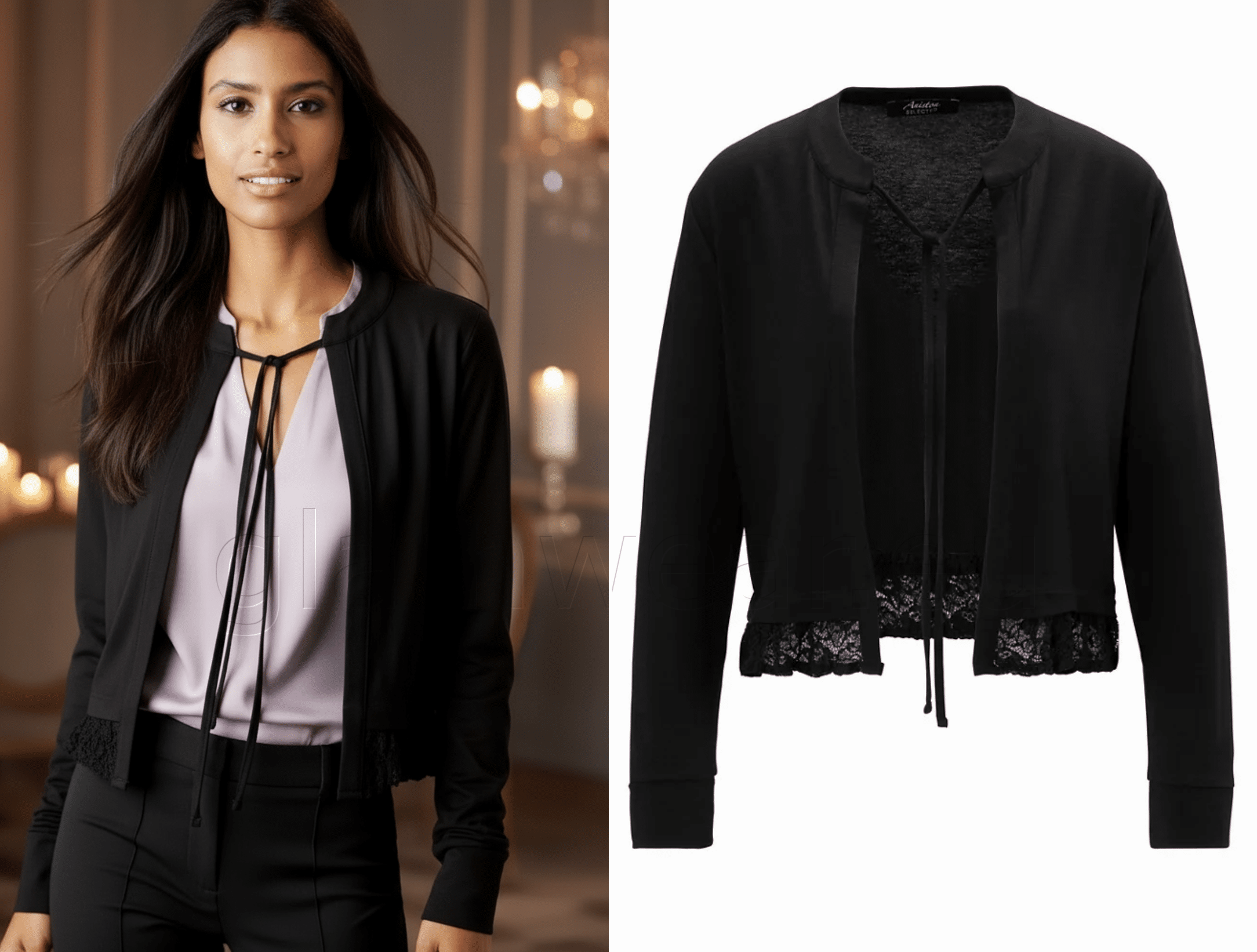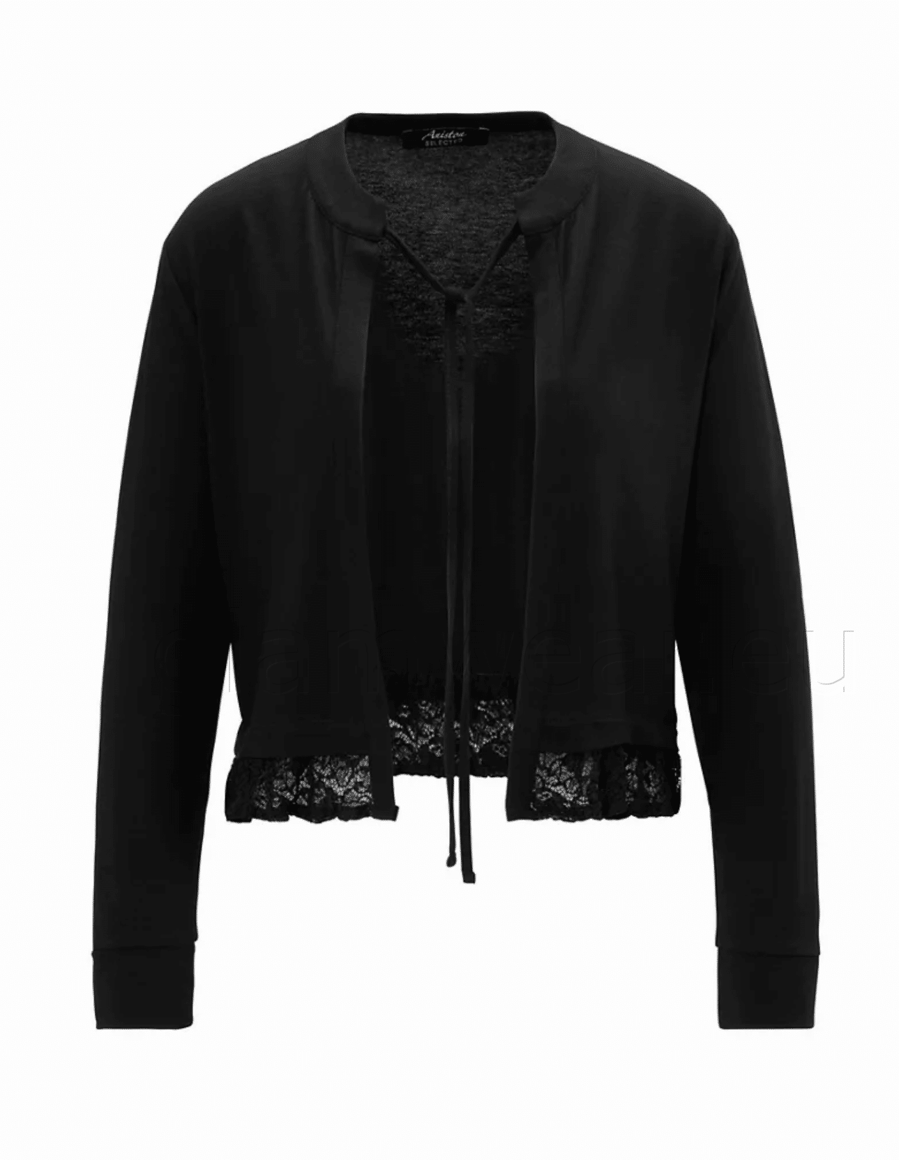 Aniston pilkupüüdev pitsilise servaga kardigan. Pitsiline alläär, paeltega seotav kaelus, pikkade varrukatega, ideaalne kombinatsioon kleitidega, üldpikkus 48cm, materjal: 95% viskoos, 5% elastaan.