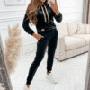 Kaheosaline veluurkomplekt. Super mugav ja kvaliteetne veluurkomplekt. Dressipluusil on moekas krae, millel on pilkupüüdev dekoratiivne kuldne nöör. Komplekt on valmistatud 95% puuvillast ja 5% polüestrist, mis muudab selle venivaks ja puudutamisel meeldivaks. Dressipluus ja püksid rõhutavad ja salendavad hästi figuuri. Pükstel taskud. Soonikäärised.