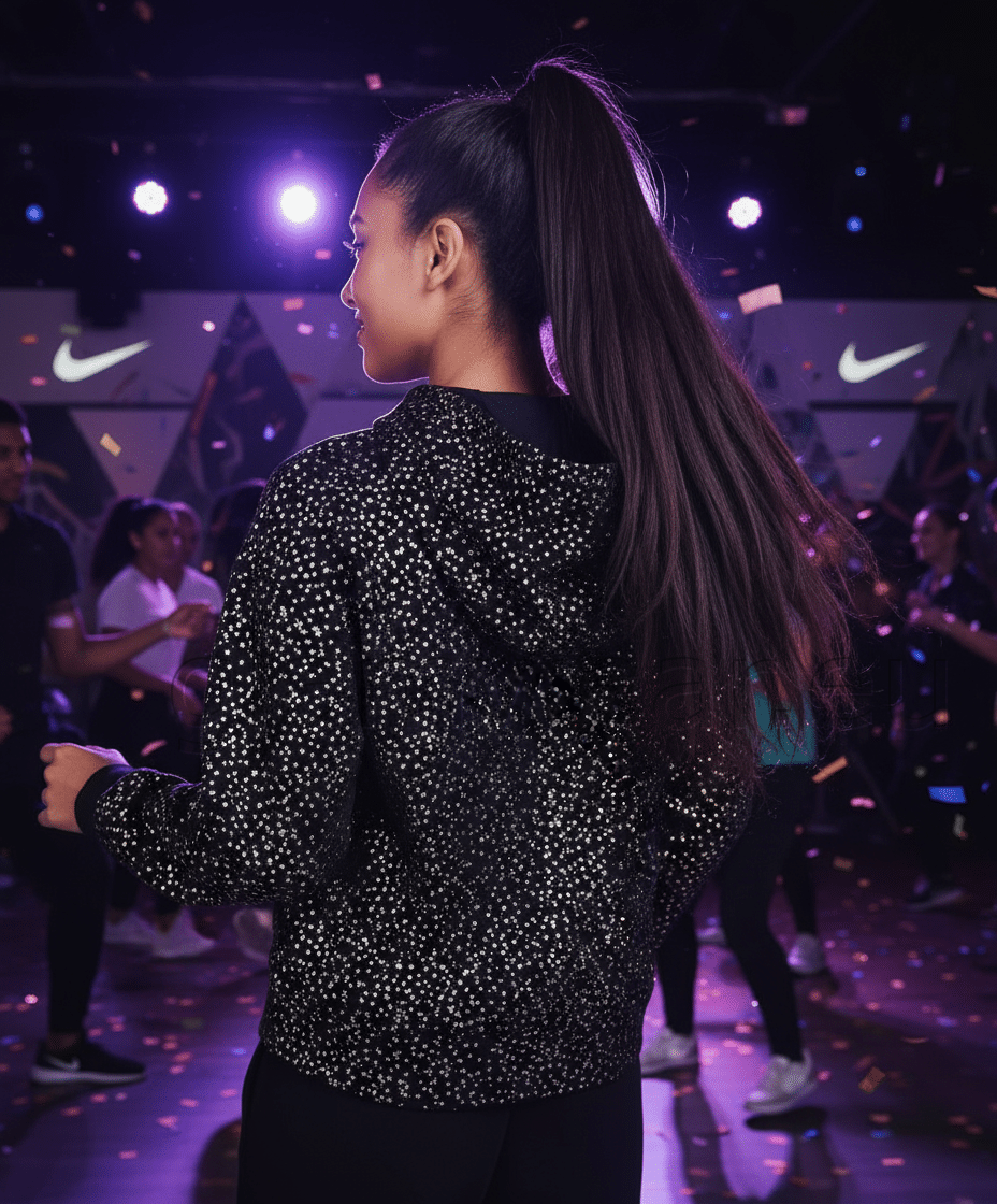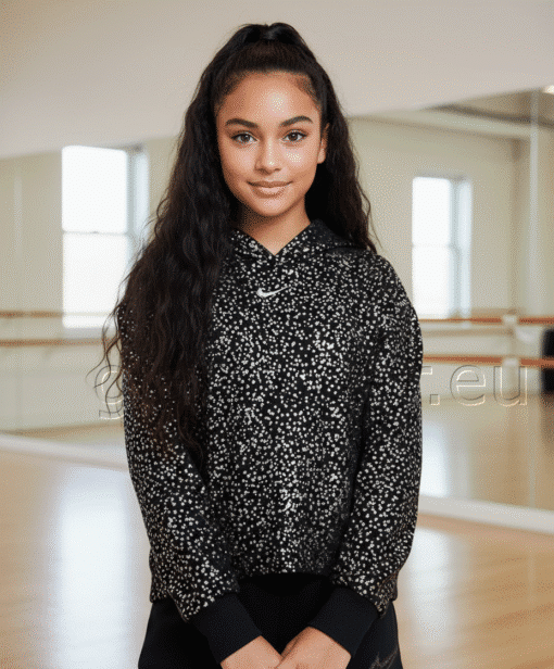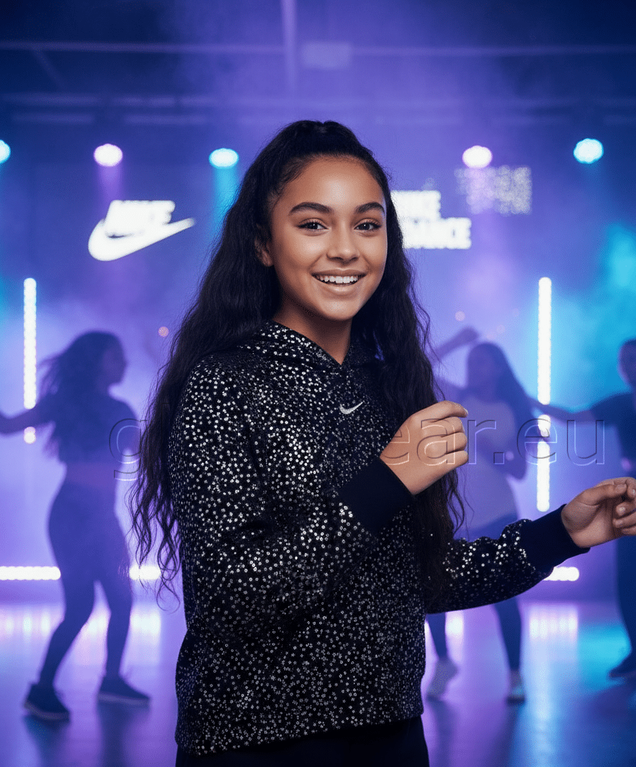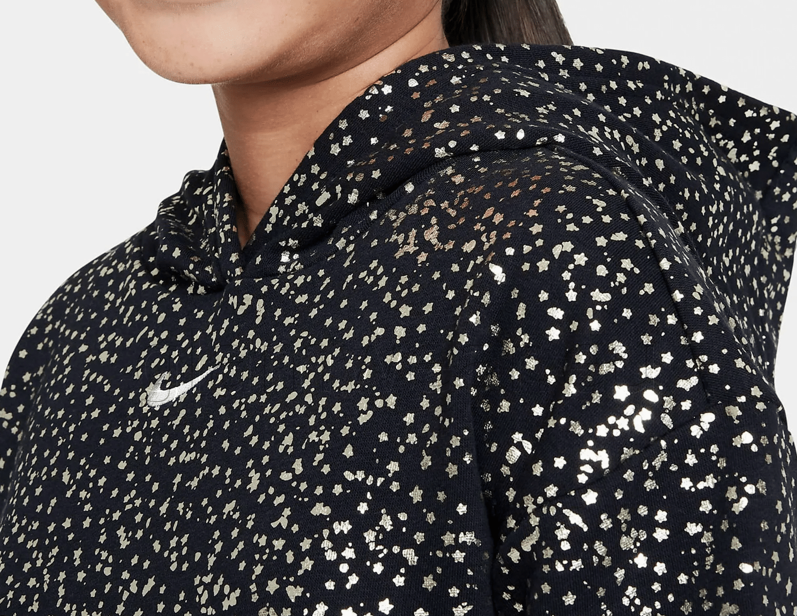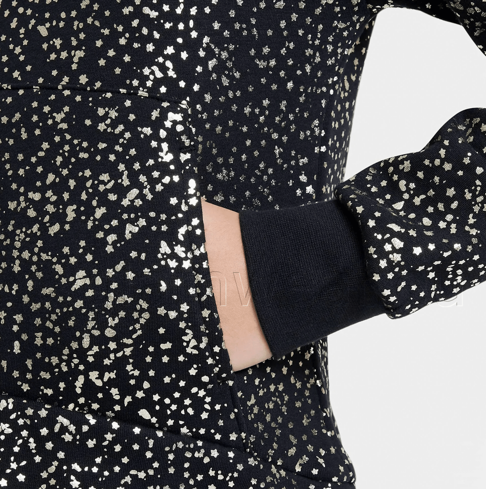 NIKE sädeleva metallik trükisega dressipluus tüdrukutele. Seest uhutud – pehme ja kohev. Pikem seljaosa pakub lisakaitset. Kapuuts, taskud, eesmine logo tikitud. Materjal: 70% polüester, 30% elastaan.