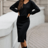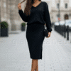 Komplekt sisaldab: ümbermõõduline dressipluus pikkade varrukatega ja V-kaelusega, midi seelik peene külglõhikuga.