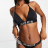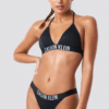 Calvin Klein kolmnurkne bikiinide ülemine osa. Trükitud logoga elastne vöökoht rinna all, paelad kaelusel ja sulgemine tagant, eemaldatavad korvid, materjal: 78% polüamiid, 22% elastaan.