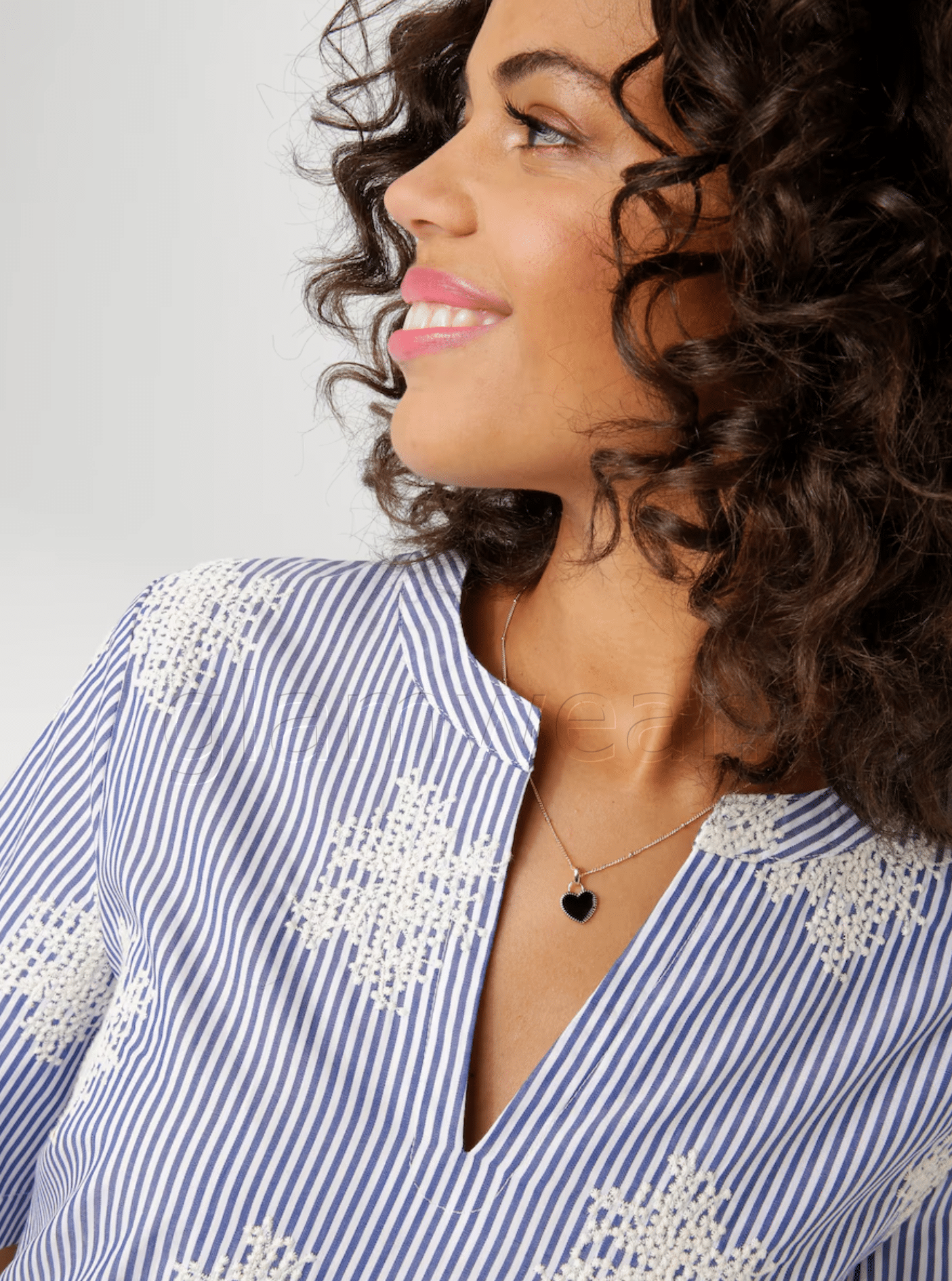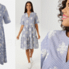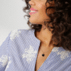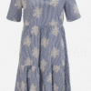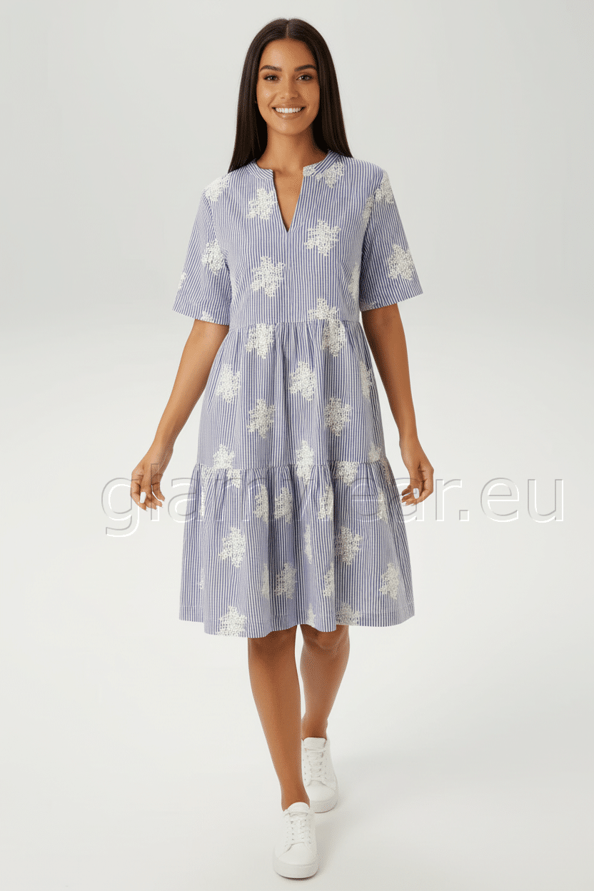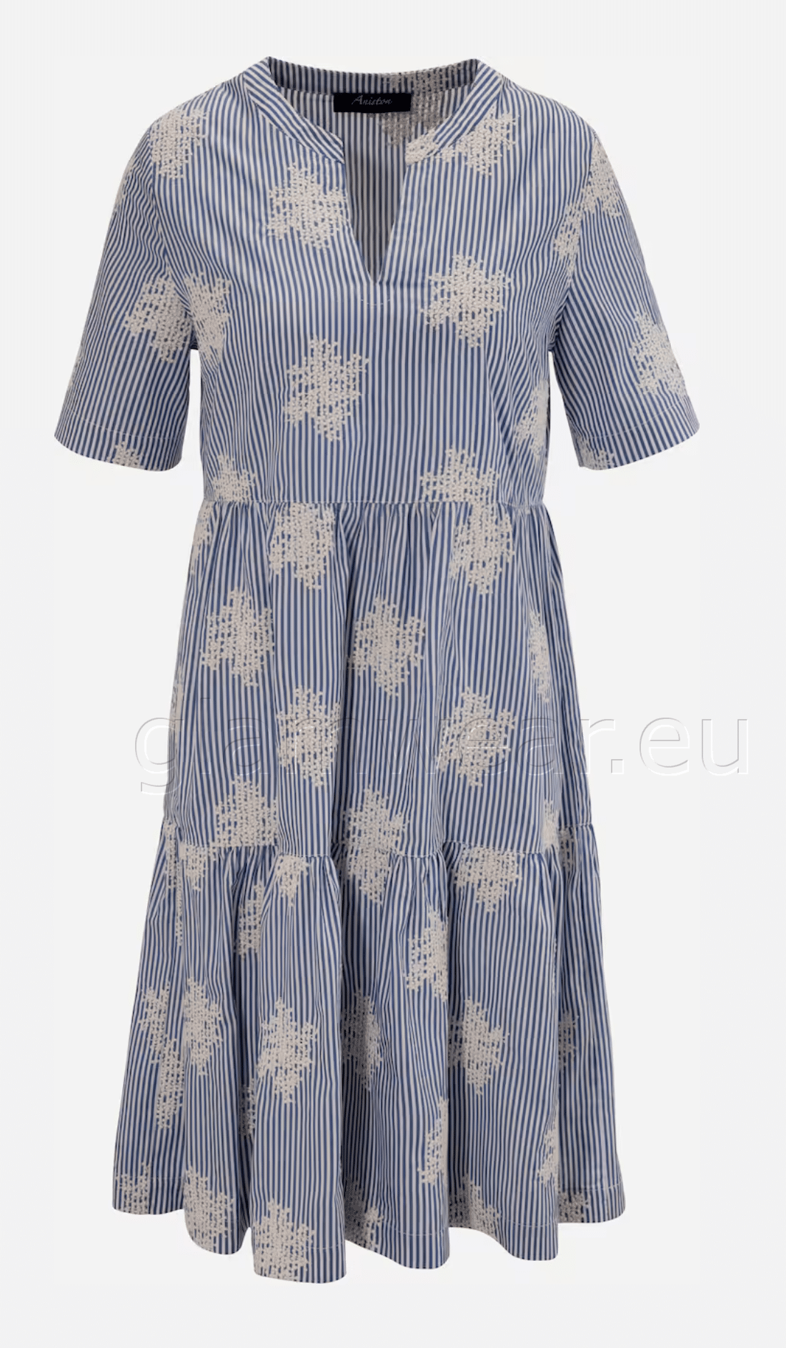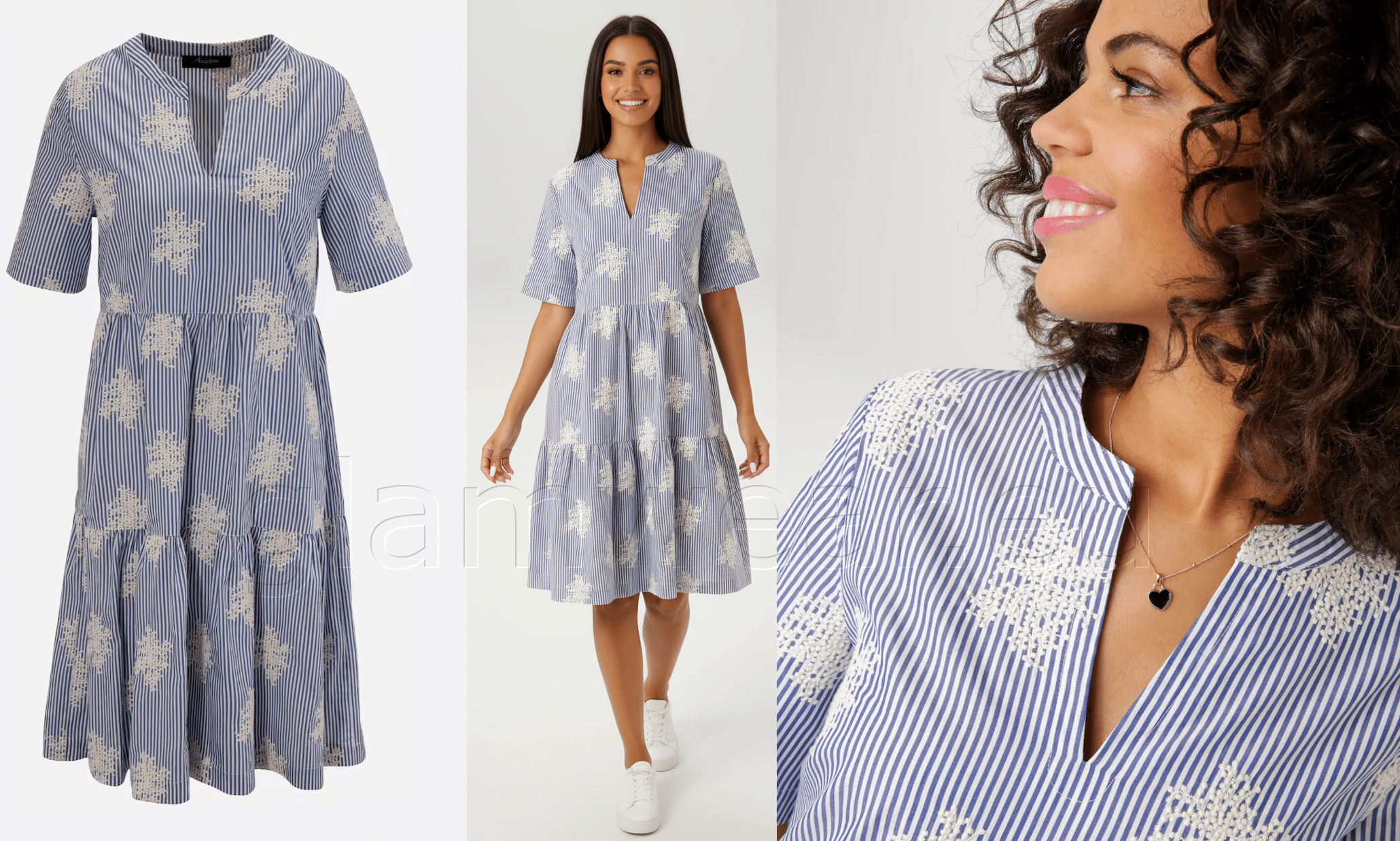 Aniston efektsete tikanditega vabaaja särkkleit. Dekoratiivse V-kaelusega kleit, triibuline ja rikkalikult tikitud – iga kleit on unikaalne, lühikeste varrukatega, materjal: 100% puuvill.