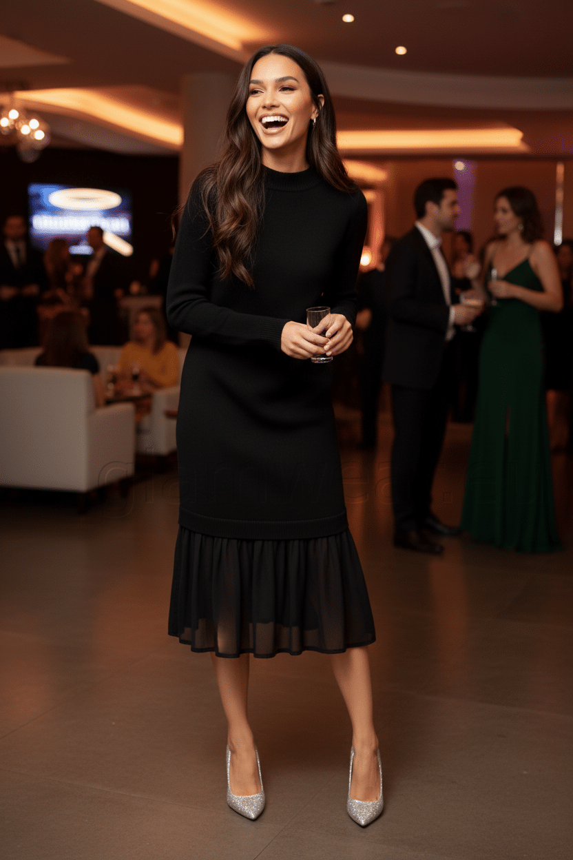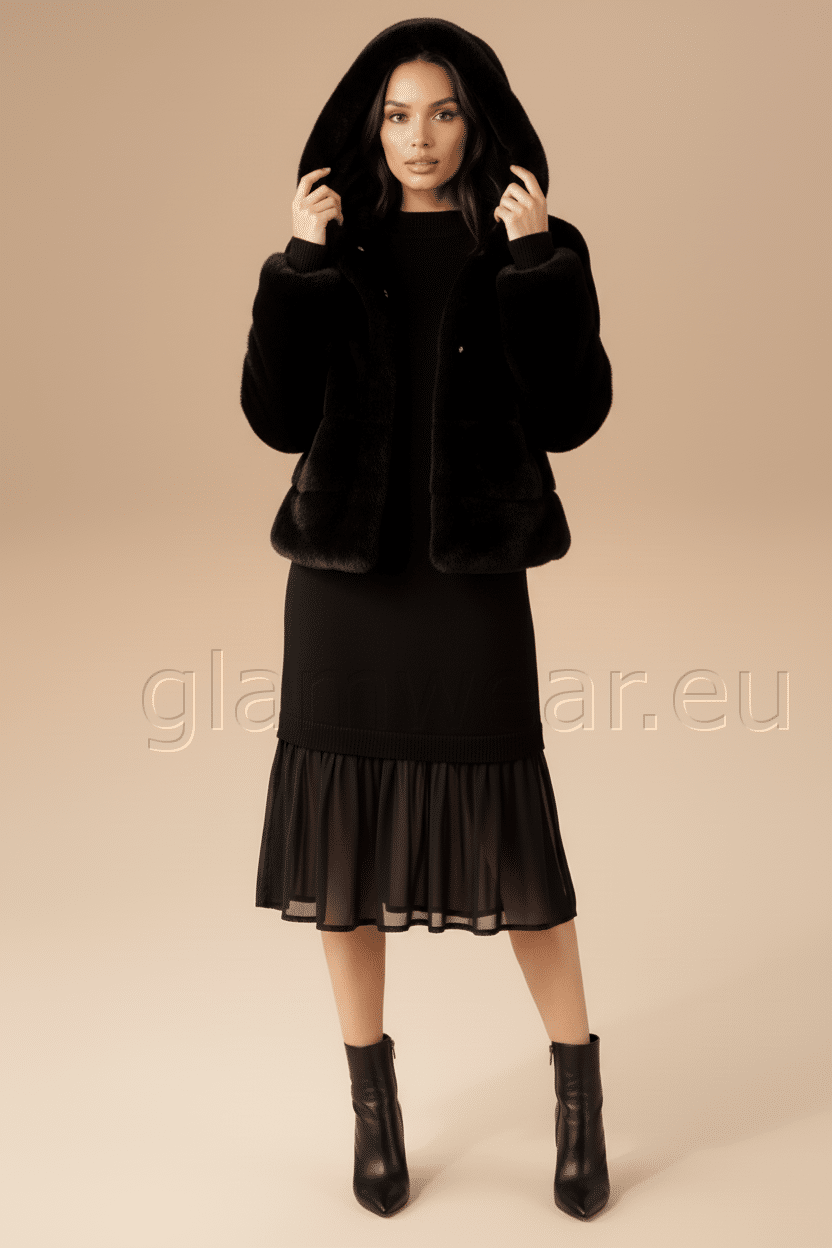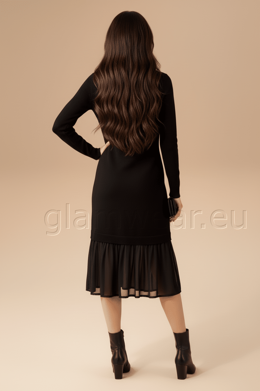Aniston šifoonist alläärega kudumkleit. Püstkraega, pikkade raglaanvarrukatega, šifoonvoltidega allääres, pehmest peenest koest, materjal: 52% viskoos, 26% polüester, 22% polüamiid. Alläär: 100% polüester. Värvitoon: must.