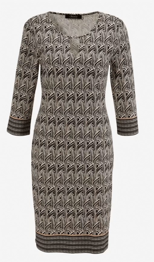 Aniston soliidne kleit naistele. Pehmest Milano soonikkoest kleit, triibulised äärised 3/4 varrukatel ja alläärel, figuuri jälgiv lõige, materjal: 89% viskoos, 9% polüester, 2% elastaan.
