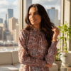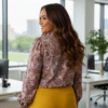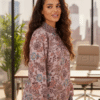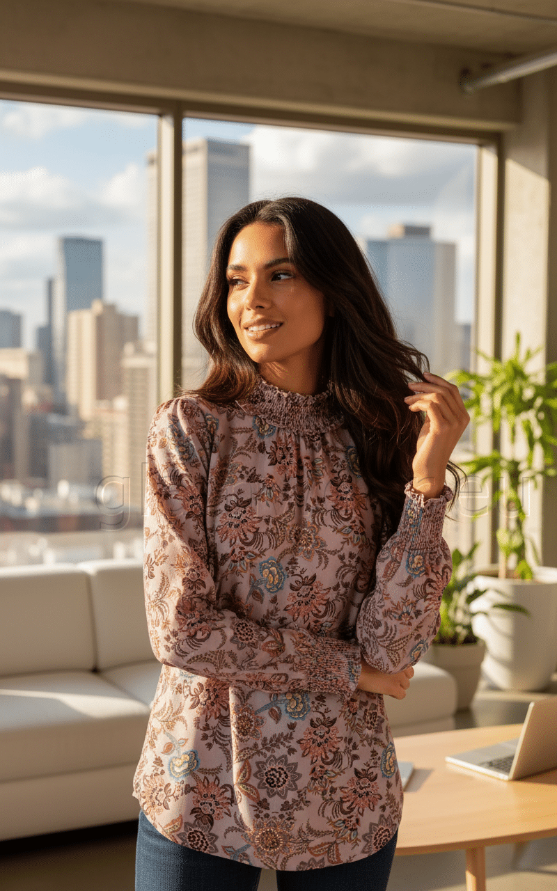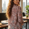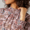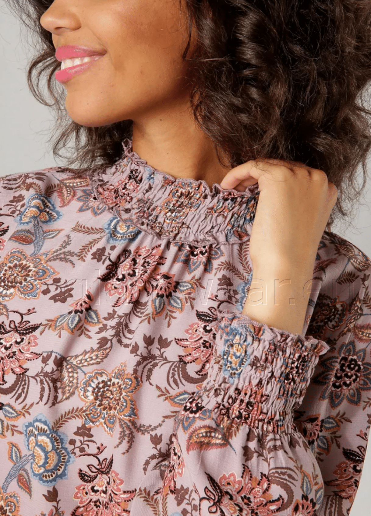 Aniston kauni mustriga pluus. Püstkrae väikeste volangidega. Modell on 1,79 m pikk ja kannab suurust 36. Fantaasiarikas lillemuster – iga muster on unikaalne. Pikkade varrukatega. Materjal: 100% viskoos.