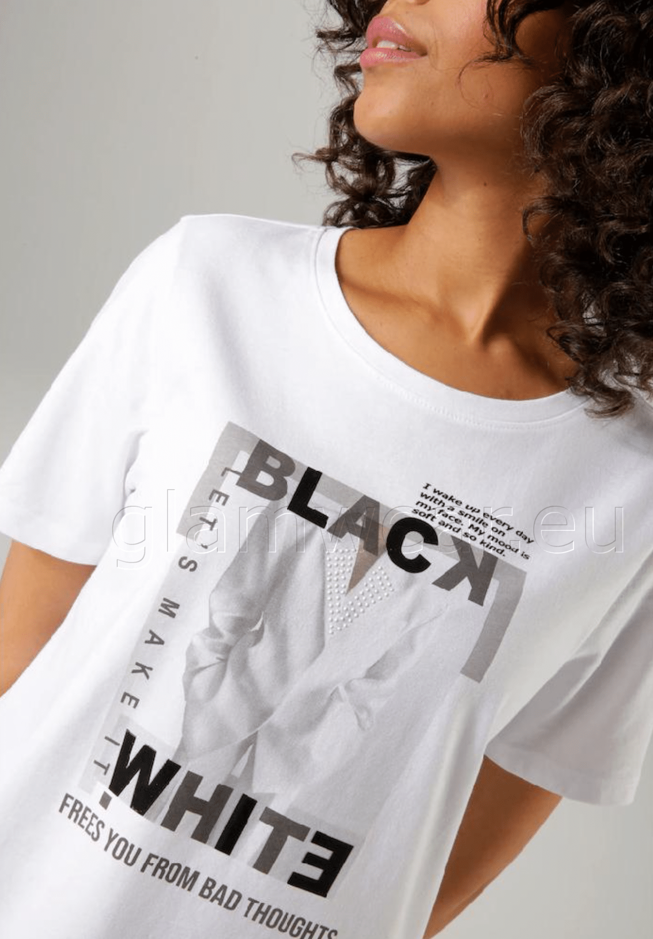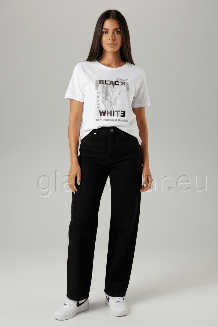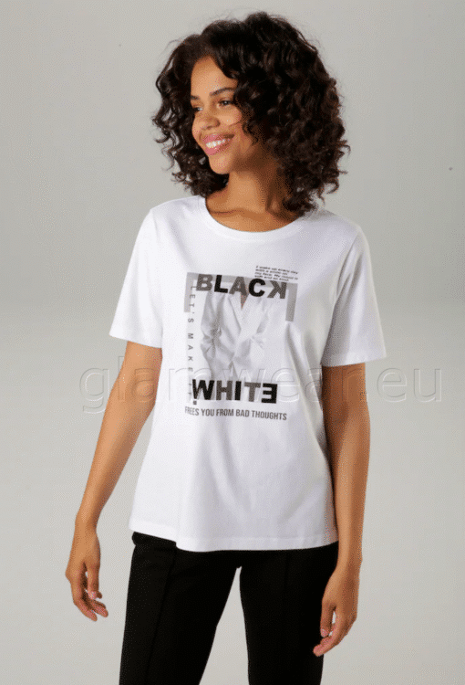 Aniston pilkupüüdva trükisega särk. Eesmine trükis väikeste dekoratiivsete helmestega, ümar kaelus ja lühikesed varrukad, materjal: 100% puuvill.