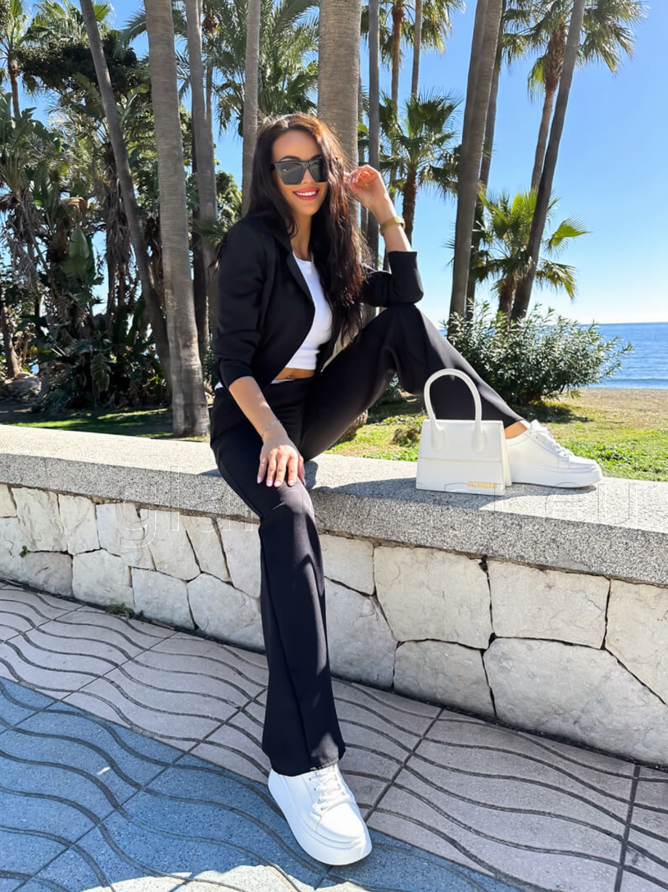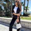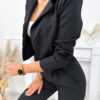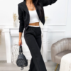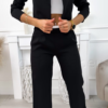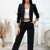 Kvaliteetne bleiser ja püksid komplekt. Selle hooaja üks moodsamaid komplekte, mis ühendab elegantsi ja mugavuse. Lühikesest pintsakust ja laiadest pükstest koosnev komplekt sobib ideaalselt nii igapäevaseks kandmiseks kui ka pidulikumateks hetkedeks. Kinnituseta, pikkade varrukatega jakk rõhutab kaunilt figuuri ning kerge õlajäikus annab stiilse ja viimistletud ilme. Laiad sirge lõikega püksid pikendavad siluetti ning on varustatud praktiliste taskutega. Vöökoha tagaosas olev elastne riba venib umbes 10 cm, tagades mugava ja hästi istuva tulemuse erinevatele kehatüüpidele. Sobib suurepäraselt nii vabaajaks, tööle kui ka erinevateks kohtumisteks. Materjal: 95% polüester, 5% elastaan.
