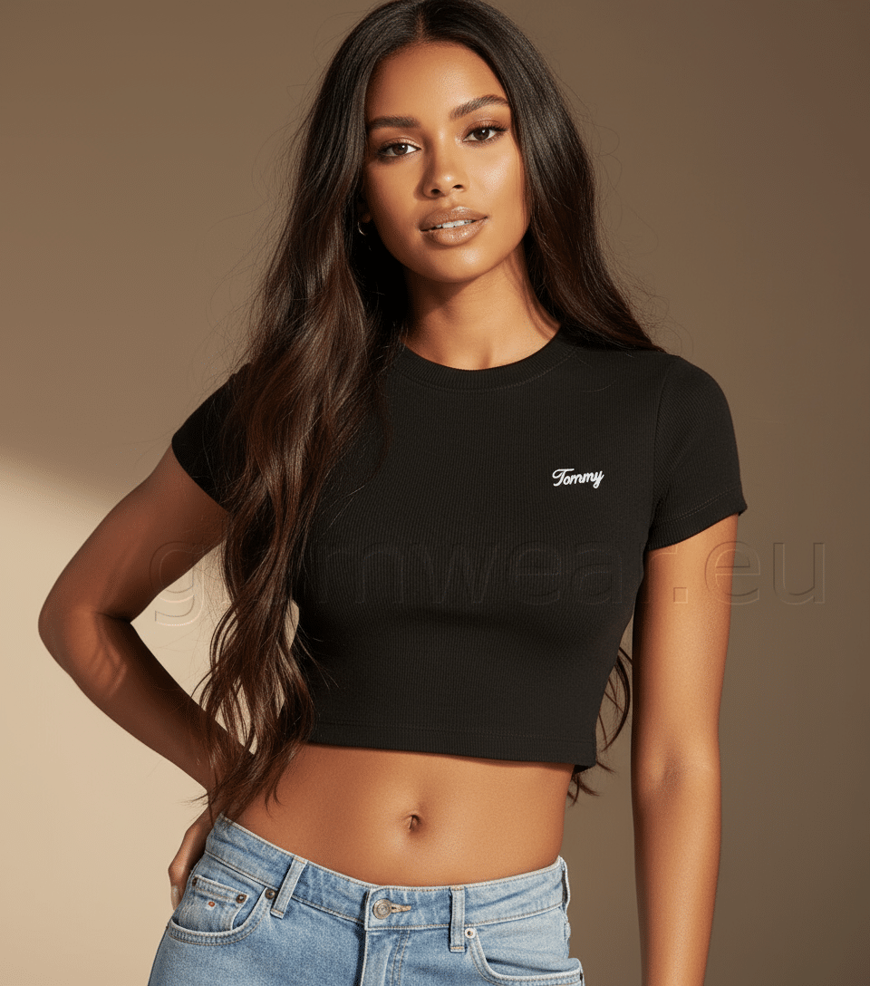 Tommy Jeans lühike topp naistele. Soonikkoes kangas kvaliteetsest elastaaniga segumaterjalist, figuuri järgiv lõige, materjal: 62% polüester, 33% viskoos, 5% elastaan.