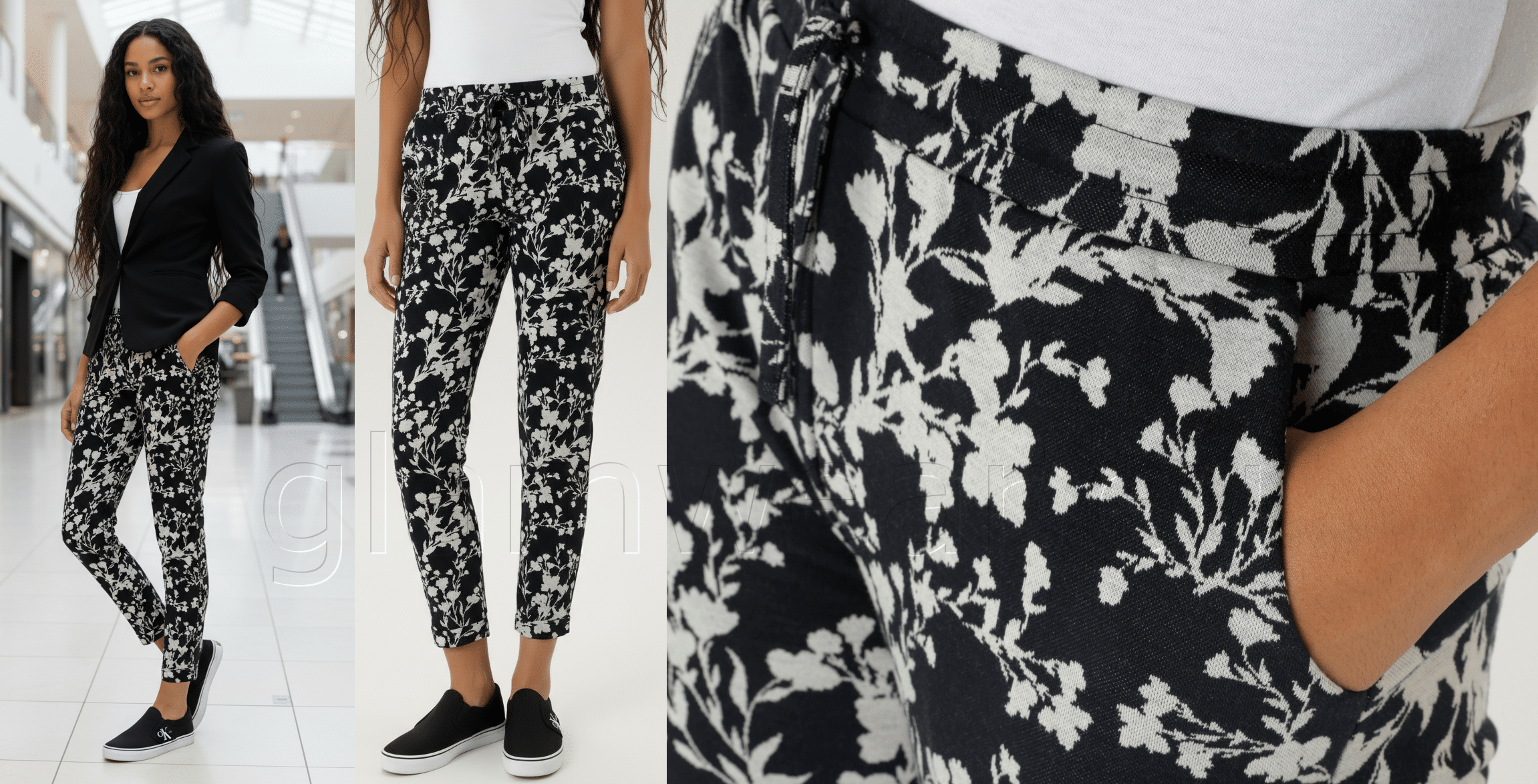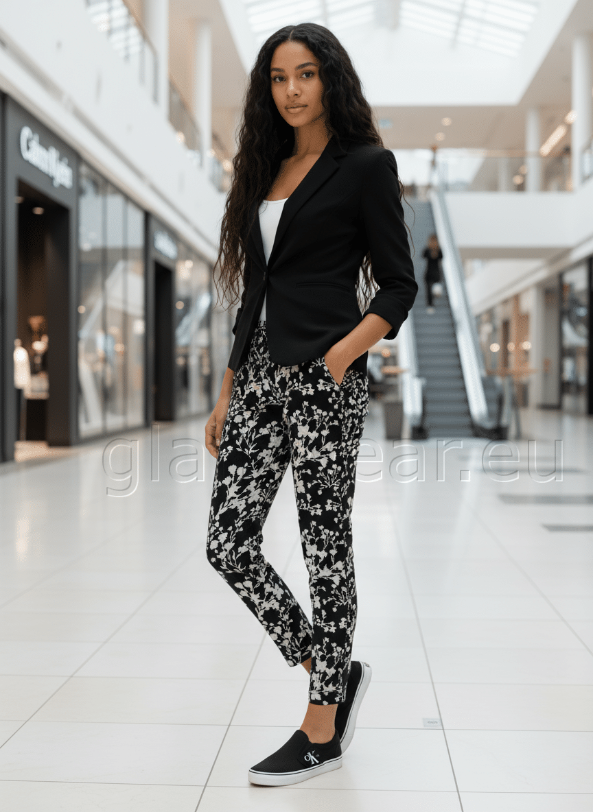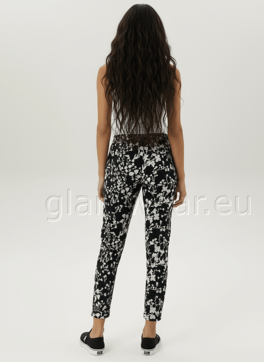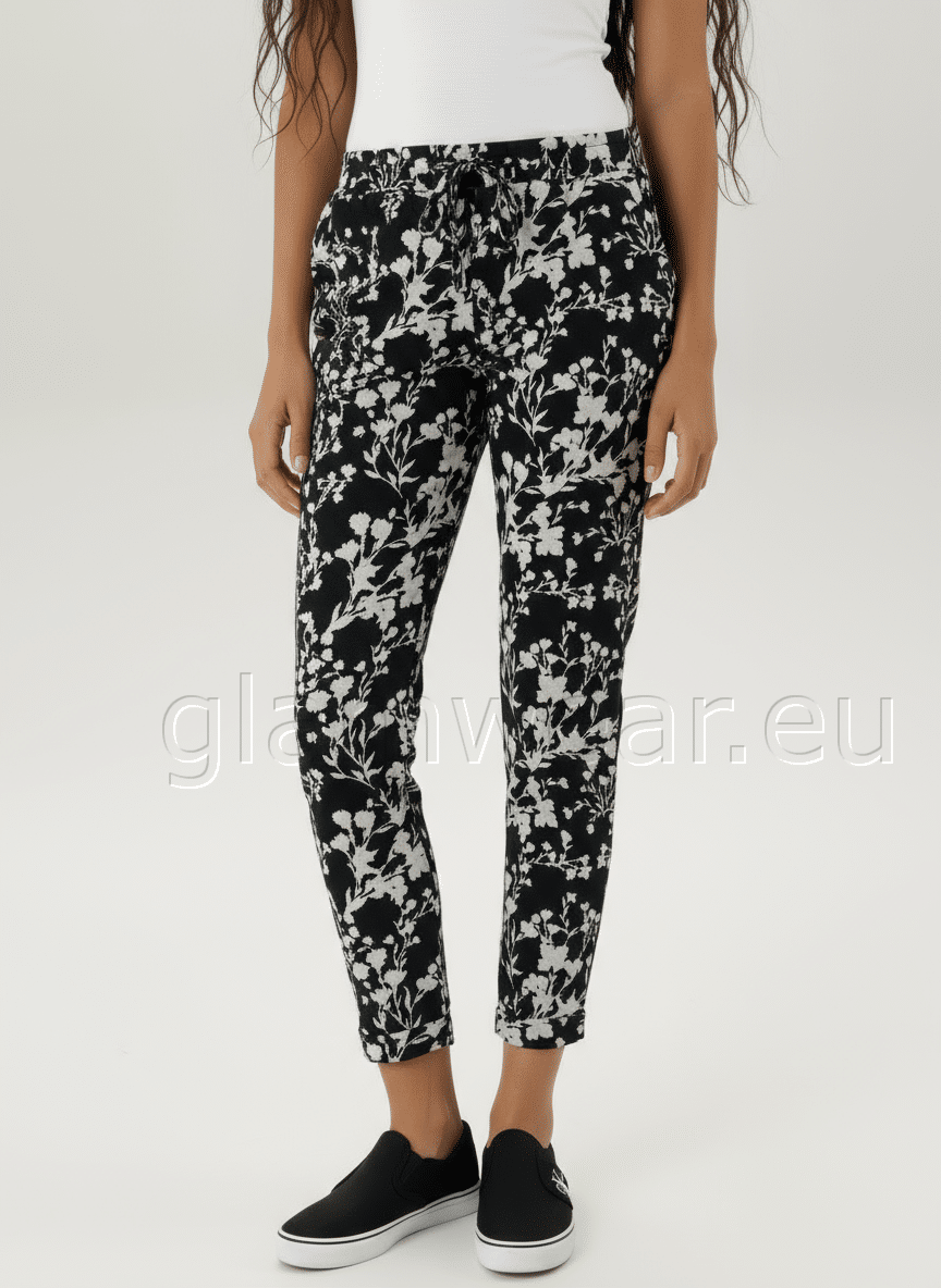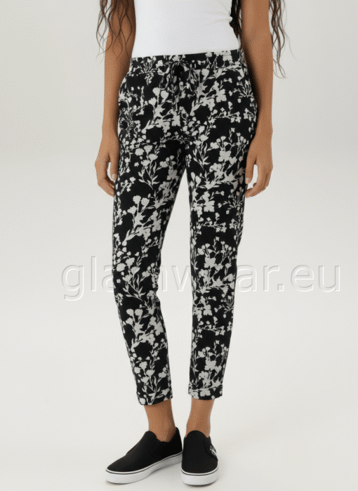Aniston pehmest kangast casual püksid. Abstraktse lillemustriga, kahe praktilise taskuga, mugava elastse ja reguleeritava vöökohaga, fikseeritud üleskeeratava sääreosaga, materjal: 67% polüester, 31% viskoos, 2% elastaan.