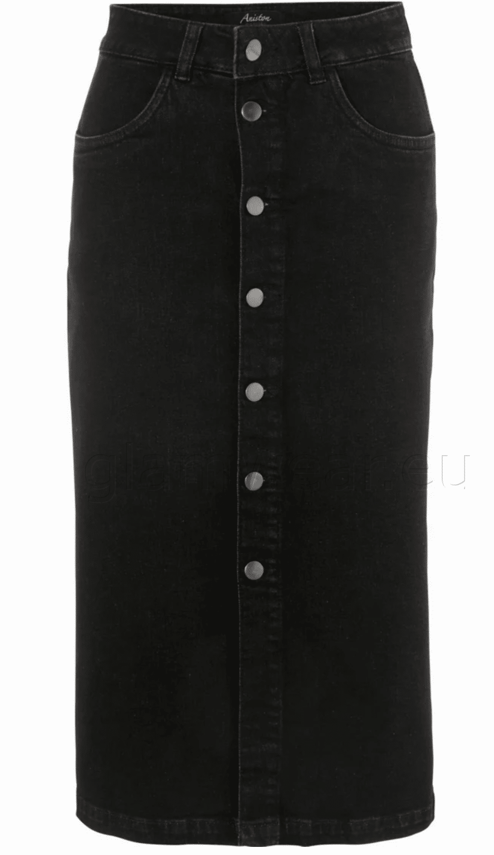 Aniston kõrge vöökohaga pikem teksaseelik. Väga figuuri järgiv naiste seelik kerge kulutatud efektiga, nööpkinnis, 2 küljetaskut, veniv materjal, materjal: 98% puuvill, 2% elastaan.