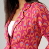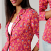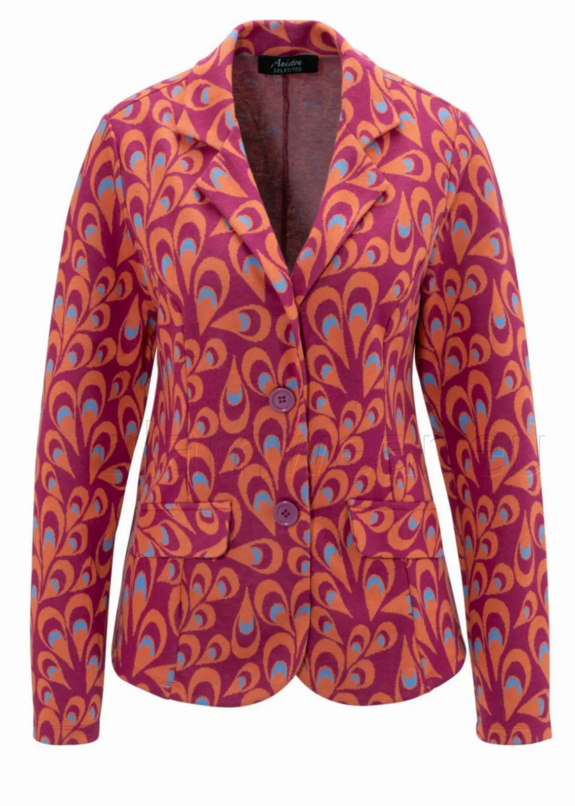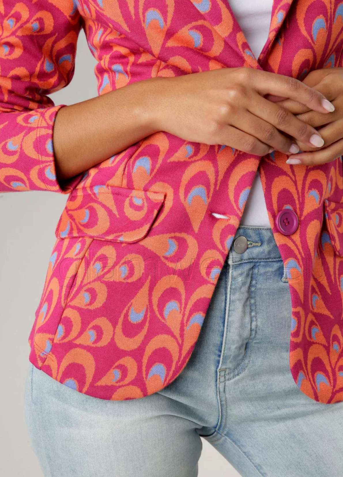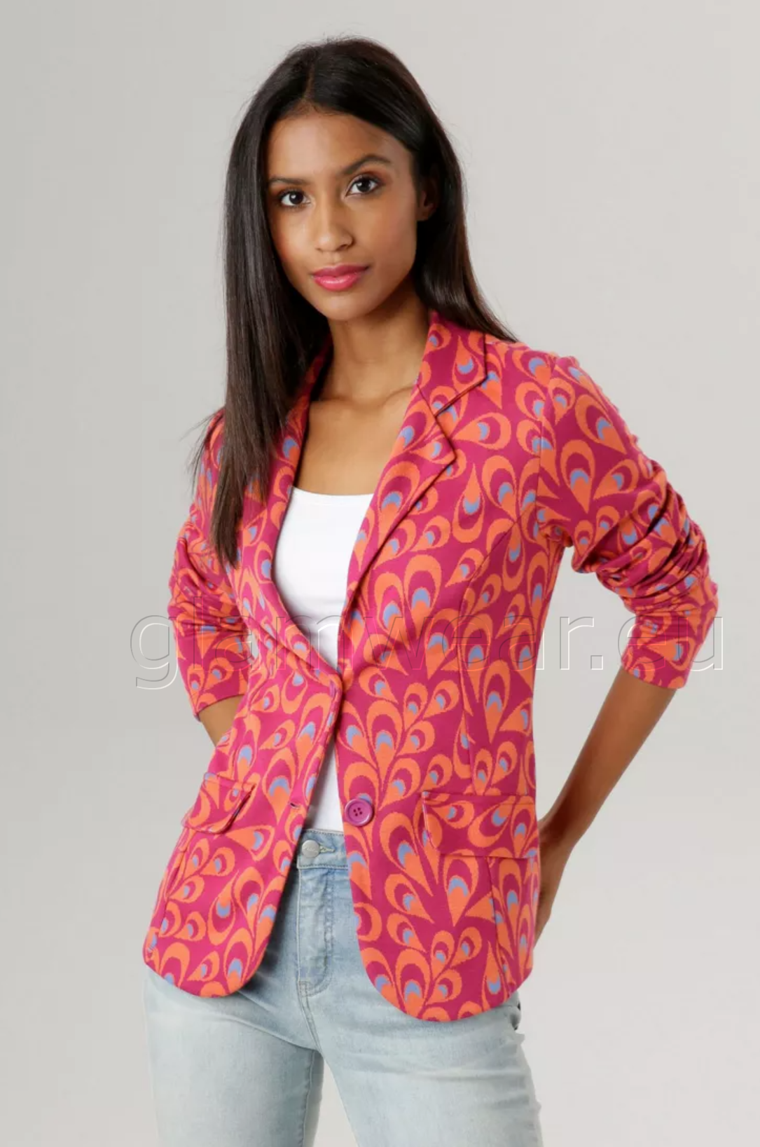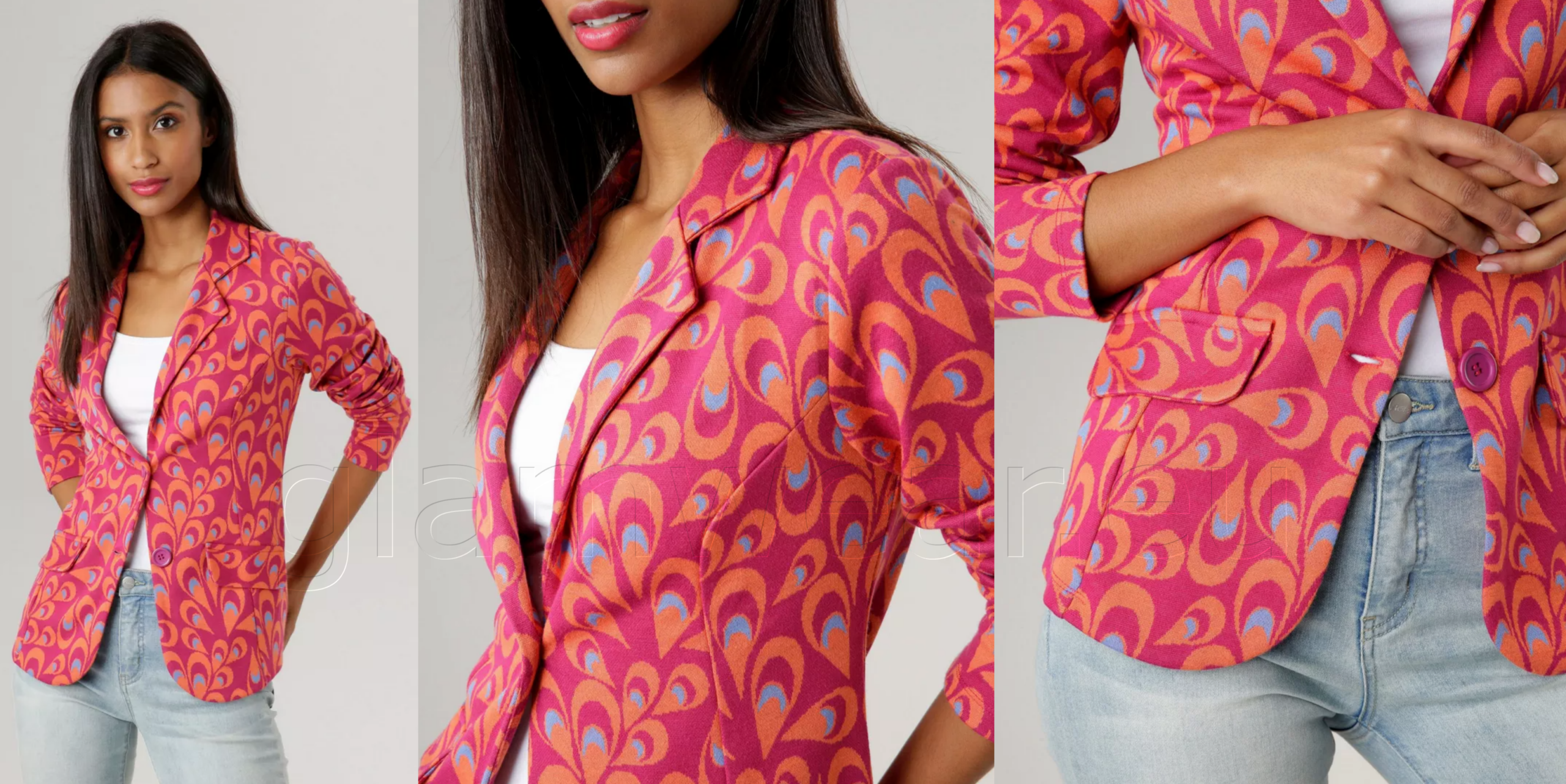 ANISTON efektne pikkade varrukatega mustriline bleiser kevadeks. Stiilne bleiser värvilise mustriga venivast žakaarkangast. Figuuri järgiv lõige annab elegantse ja naiseliku silueti. Klassikaline sälguline reväär ja kahe nööbiga kinnitus muudavad pintsaku sobivaks nii tööle, pidulikumaks sündmuseks kui ka igapäevaseks stiilseks komplektiks. Dekoratiivsed kunstklapiga taskud ja kvaliteetne veniv kangas tagavad mugavuse ning hea istuvuse. Materjal: 68% polüester, 27% viskoos, 5% elastaan.